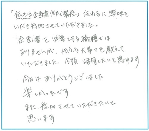 「伝わる企画書作成講座」伝わるに興味をいだき参加させていただきました。