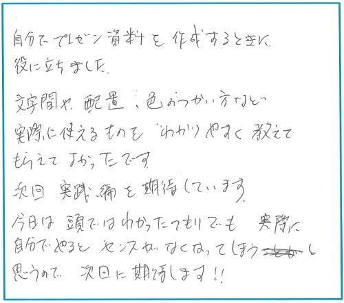見る人に訴えかける企画書の作成を教わりにきましたが、テクニックだけでなく心構えを学ばせていただきました。