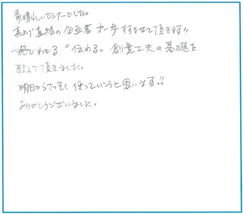 素晴らしいセミナーでした。 売上げ直結の企画書第一歩すすませて頂きます!!