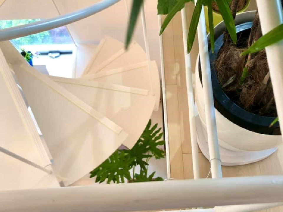 大きな葉っぱが、螺旋階段のカーブがつくる空間を埋めてくれています。