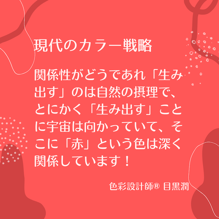 そういう風に考えると、関係性がどうであれ、「生み出す」のは自然の摂理で、とにかく「生み出す」ことに宇宙は向かっていて、そこに「赤」という色は深く関係しているように思います。