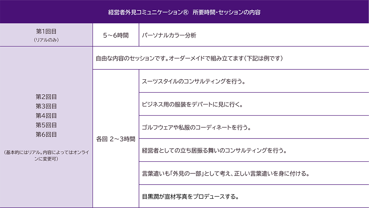 第1回目は「パーソナルカラー分析」を行いますが、第2回目以降は、外見も内面も「社員に誇りに思われる経営者」になるためのセッションを、オーダーメイドで組み立てます。