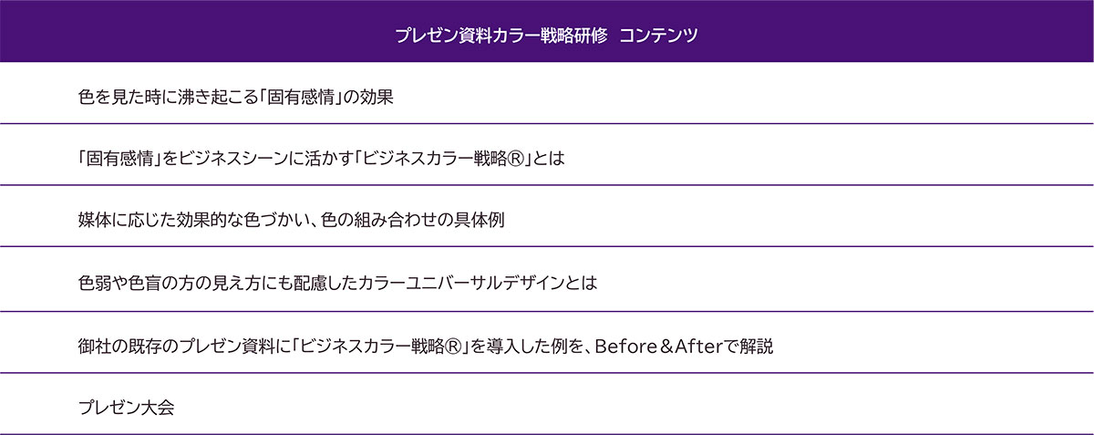 プレゼン資料の「作成」からプレゼンの「現場」までシームレスにできるのが「プレゼン資料カラー戦略研修」です。