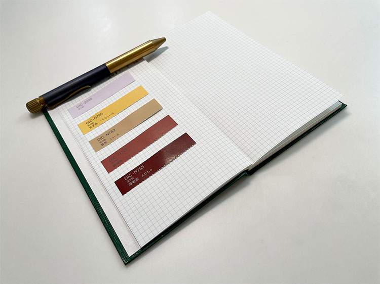 でもこの測量野帳は、中が方眼紙になっているので、綺麗に揃えて貼れるし、印刷会社の方との打ち合わせ事項も横に書き込めるので、色校の日の持ち運びにすごく便利です!