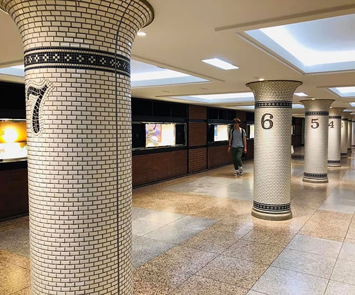 東京メトロ銀座駅直結の地下通路がずっと工事中だったのですが、数日前に、こんなステキなタイル貼りの柱がお目見えしました!